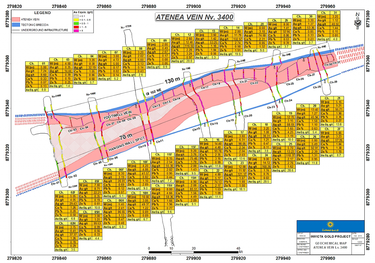 Detailed Assay Results from Underground Channel Sampling of the Atenea Vein on 3400 Level, Invicta Gold Mine